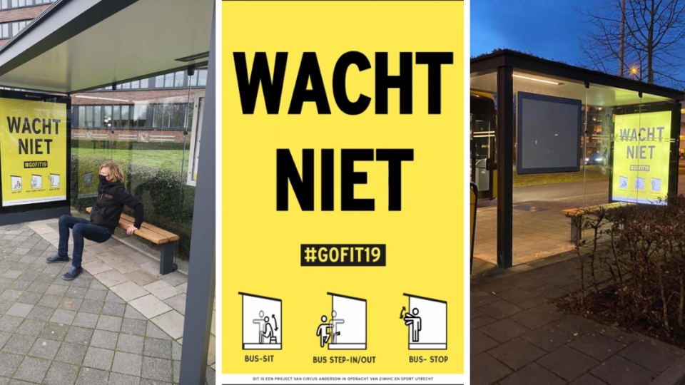 Dit project is bestaat uit een regionale postercampagne in de bushokjes van Utrecht. De Busganger wordt uitgedaagd om actief te wachten met korte work-out oefeningen: De Bus-Sit, De Bus-Step en de Bus-Stop. Dichtbij de bushokjes zijn GOFIT-19-Ballen geplaatst. Een plek om je frustratie te omarmen of van je af te slaan.