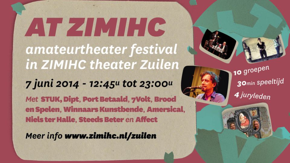 Aan het AT ZIMIHC amateurtheaterfestival 2014 deden tien groepen mee: STUK, Dipt, Port Betaald, 7Volt, Brood en Spelen, de Winnaars Kunstbende, Amersical, Niels ter Halle, Steeds Beter en Affect.