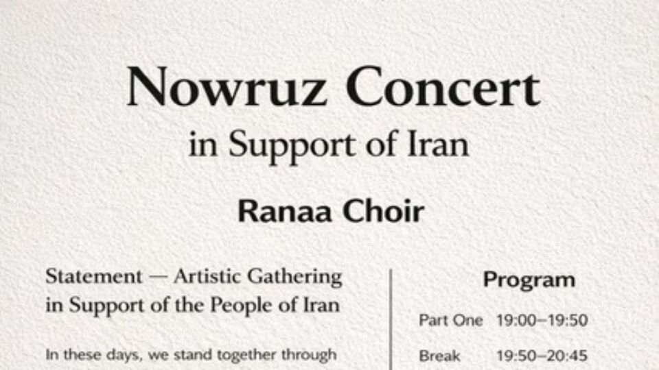 De groep Vocaal Ensemble Ranaa organiseert een benefietconcert met muziek, verhalen en beeldende kunst. Met dit initiatief willen zij een plek bieden om zorg en verdriet te delen en aan Iran en haar mensen te denken. Zo willen zij verbondenheid en steun bieden.