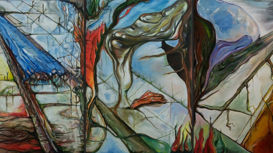Sinds enige tijd is Frido ter Beek ook aan het schilderen. Hij schildert vaak nogal intuïtief en begint zomaar ergens. Als er dan een idee ontstaat of meer vastomlijnd raakt, gaat hij heel precies te werk en raakt hij geobsedeerd. Het lukt Frido meestal niet om abstract te zijn. Hij zit vast aan organische vormen en gegevens die ook in het dagelijks leven voorkomen. Maatschappelijke betekenissen en politieke statements zal je in zijn schilderijen dus niet tegenkomen, die mag je er zelf bij zoeken!