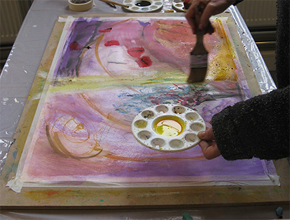 In ZIMIHC theater Wittevrouwen geeft Karin Groeneweg de cursus intuïtief tekenen en schilderen vanuit beweging. In deze cursus worden geen “mooie” schilderingen gemaakt. Het uitgangspunt is dat je vanuit je gevoel en emoties intuïtief tekent en schildert. Je reageert steeds weer op dat wat er op het papier ontstaat. De kunst is om zolang mogelijk niet te weten wat en hoe het gaat worden. Zo schildert het schilderij zich als het ware zelf en speelt het toeval een grote rol.