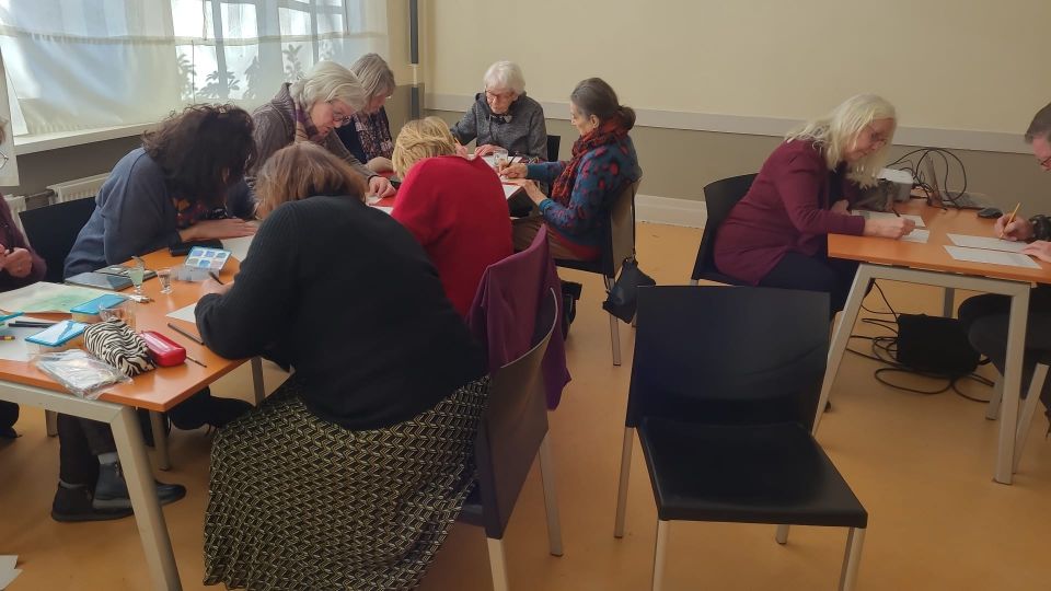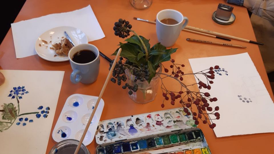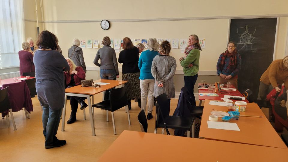 Wat denk je bijvoorbeeld van jezelf tekenen met je ogen dicht? Van een klein stukje van een grote stapel meegebrachte voorwerpen weergeven, maar dan met in elkaar overlopende lijnen en kleuren? En dan toch zo dat je weet wat het voorstelt? Of wat denk je van het illustreren van een kinderboek? En van elkaar van top tot teen tekenen of schilderen en dat dan daarna weer samenvoegen tot een groepsportret?