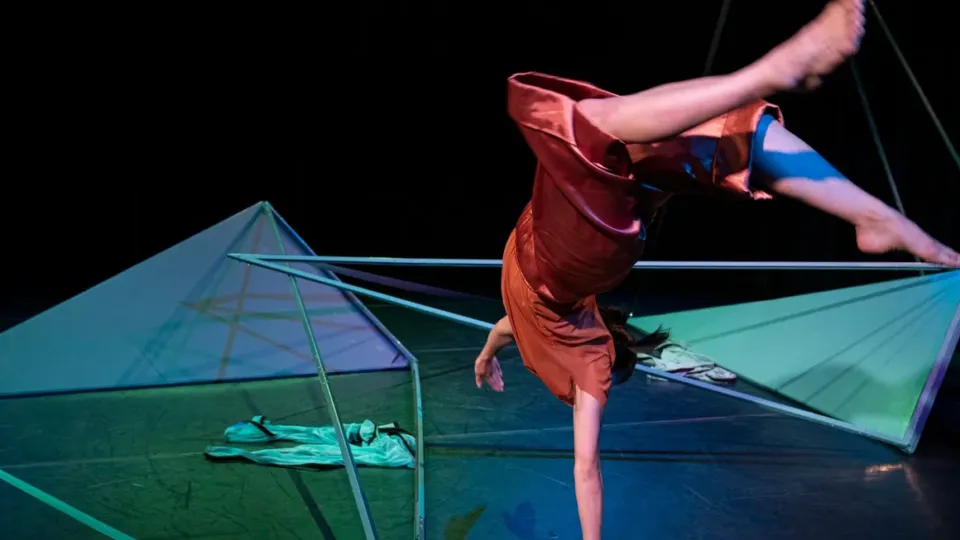 LiCHT is een dansvoorstelling waarin een danser en een luchtacrobaat spelen met reflecties, kleuren en perspectieven.