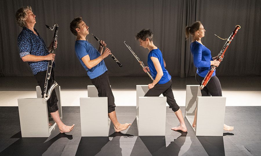 Strek is een muzikaal spel van vier musici in een strakke en rechte wereld.