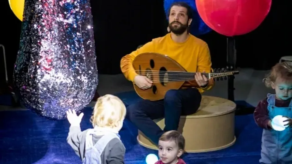 Ook hoor je in Jabers composities invloeden van muziek van over de hele wereld en van alle tijden terug. De klanken prikkelen de verbeelding en doen je met een glimlach terugdenken aan plekken waar je zelf misschien nog nooit bent geweest. Ouder en kind hebben een eigen zitplek in dit decor, maar rondkruipen mag ook.