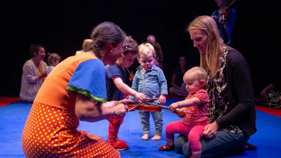 Geniet met je dreumes van vrolijke klassieke klanken! Samen zingen we bekende kinderliedjes en spelen we kiekeboe op de muziek van Beethoven. De dreumesen dansen en spelen op het grote kleed mee op betoverende strijkmuziek van Bach, Vivaldi en Rameau, dichtbij de muzikanten. Aan het einde van het concert mogen ze meedoen in de vioolspeeltuin en zelf op een écht viooltje spelen! Een concert voor verwonderde oortjes, dansende voetjes en wiebelende kontjes!
