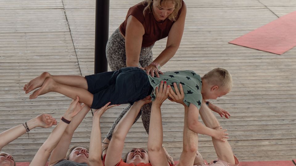 Annelies van Dam, yogajuf en (fysio)therapeut, weet als moeder hoe verbinding én spelen in de familie acrobatiek en yoga te brengen.