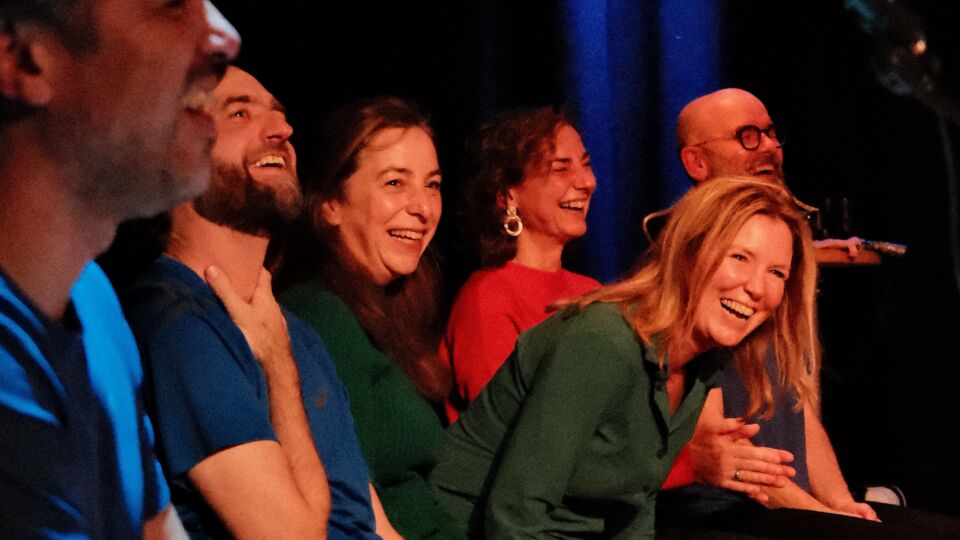 Vijf acteurs en een muzikant improviseren vrijuit op een interview met Glenn op het podium.