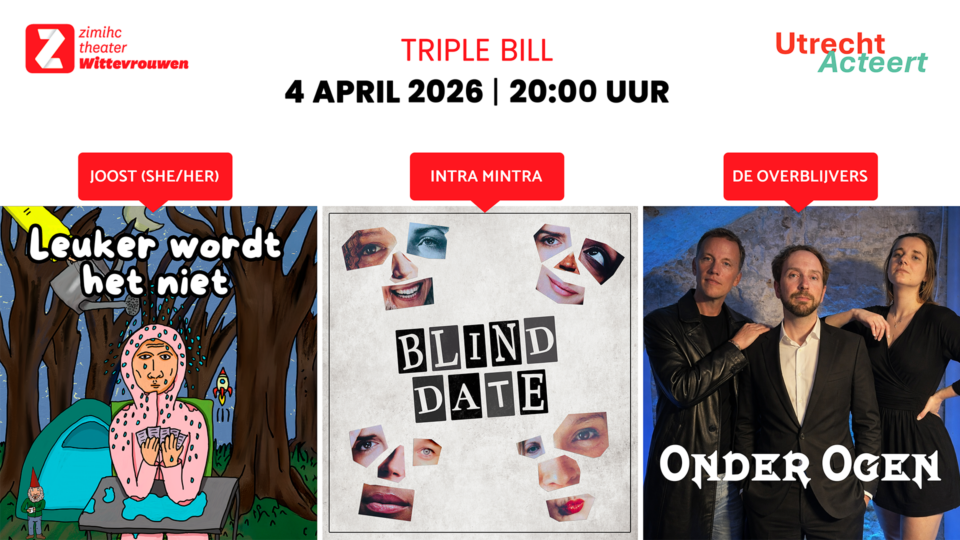 Tijdens deze Triple Bill bundelen drie Utrechtse theatergroepen hun krachten. Op één avond beleef je maar liefst drie unieke voorstellingen – drie verhalen, drie stijlen, één bijzondere theaterervaring.