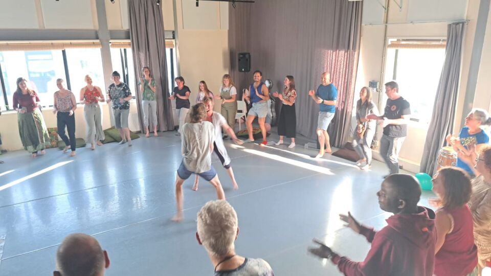 In de community zijn dansers, bewegers, muzikanten en andere makers. Samen delen we een mooie danszaal en atelier.