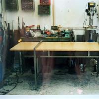 Hout en staal worden door De Toorts , naar eigen ontwerp, met elkaar in combinatie gebracht tot meubilair met een uniek uiterlijk