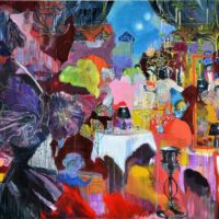 Vage ideeën, scenes of settings zijn vertrekpunt die in meerdere schilderlagen leiden tot een complexe en schijnbaar ongeordende voorstelling. Ik voeg steeds figuren, dikke verfvlekken en ook fijnere details toe. Veel hiervan verdwijnt weer, omdat het toch niet past. Zoals in ‘Banquet’, waar veel verschillende figuren de revue zijn gepasseerd.