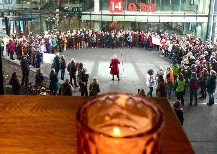 Geef het vuurtje door. Om onze oproep onder de aandacht te brengen, zingen wij (een groeiende gelegenheidsgroep vrouwen) op woensdagen het eenvoudige refrein van het lied Prayer of the Mothers bij station Utrecht. We nodigen het publiek uit om mee te zingen. We zongen dit voor het eerst op 1 november met 150 vrouwen. Op 8 en 15 november zongen daar 300 vrouwen. Inmiddels wordt de organisatie van de samenzang in Utrecht gedragen door een groeiende groep vrouwen. Je kan iedere woensdag om half 12 aansluiten bij deze ‘flashmob’ van 10 minuten. Zie meer video’s van samenzang op ons startende youtube kanaal.