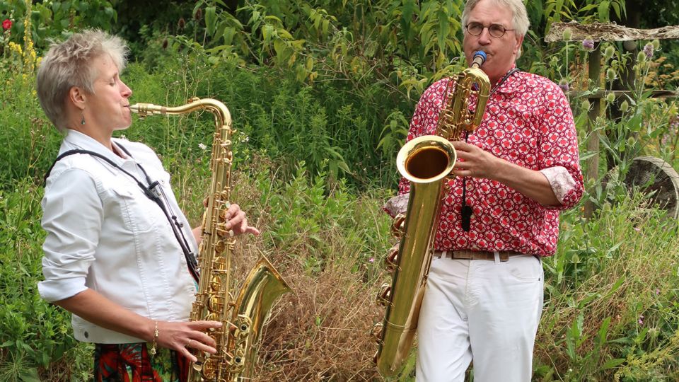 De muziek van Saxuo beweegt zich in het brede gebied van de geïmproviseerde wereld muziek. Naast uitgeschreven stukken dagen we elkaar uit in improvisaties waarbij afwisselend de ene en de andere sax de lead neemt.