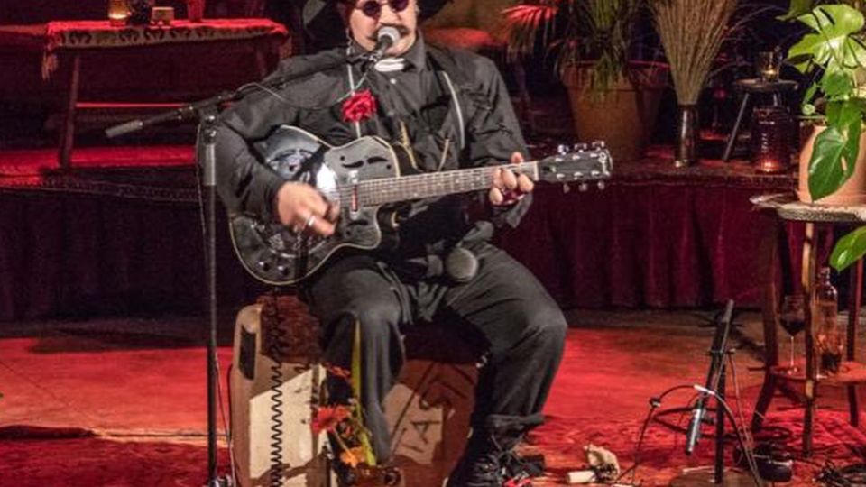 Uit een donkere kier tussen onze podiumplanken komt delta blues priester VAN TASTIK
